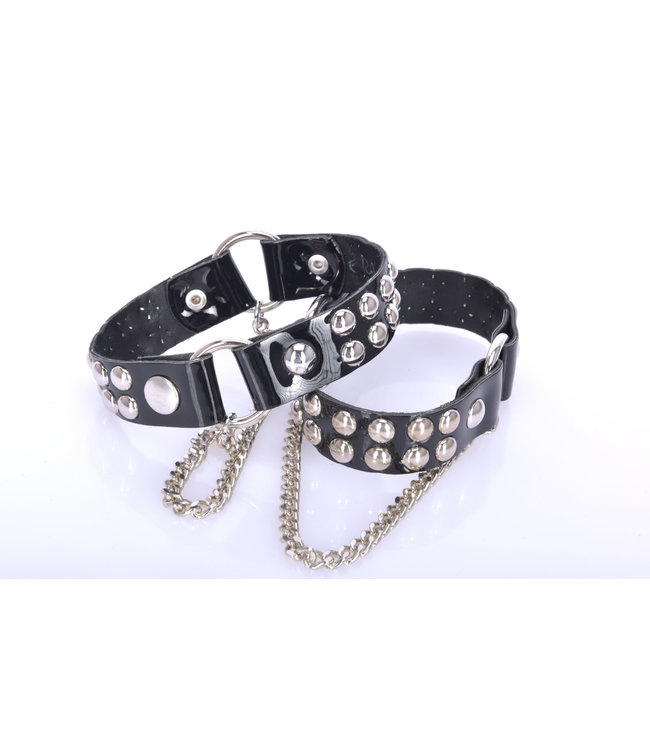The LEA boots belt is made of synthetic shiny patent vinyl in Italy. Easy & secure click-on and click off. Two rows of metal studs on the leather belt. A single metal chain.