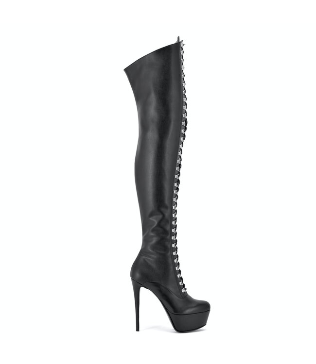 De Nigella Lace-Up Thigh Boots Black Matte zijn de perfecte mix van elegantie en fetish. Het ontwerp met een volledig verstelbare vetersluiting aan de voorkant zorgt voor een stoere en sexy look. Deze laarzen zijn handgemaakt in Italië met een focus op vakmanschap en kwaliteit. Ze hebben een hak van 15 cm met een plateau van 5 cm voor de ultieme fetish-look en een perfecte voetboogondersteuning. Gemaakt van hoogwaardige Italiaanse synthetische materialen, is het nauwelijks te zien dat het geen echt leer is. De ronde neus zorgt voor een betere pasvorm en draagt bij aan de stoere, sexy uitstraling van de laarzen. Verkrijgbaar in verschillende maten en kleuren, zoals matzwart en glanzend zwart. Of je ze nu combineert met een gewaagde outfit of met een jeans, met deze laarzen maak je gegarandeerd indruk.